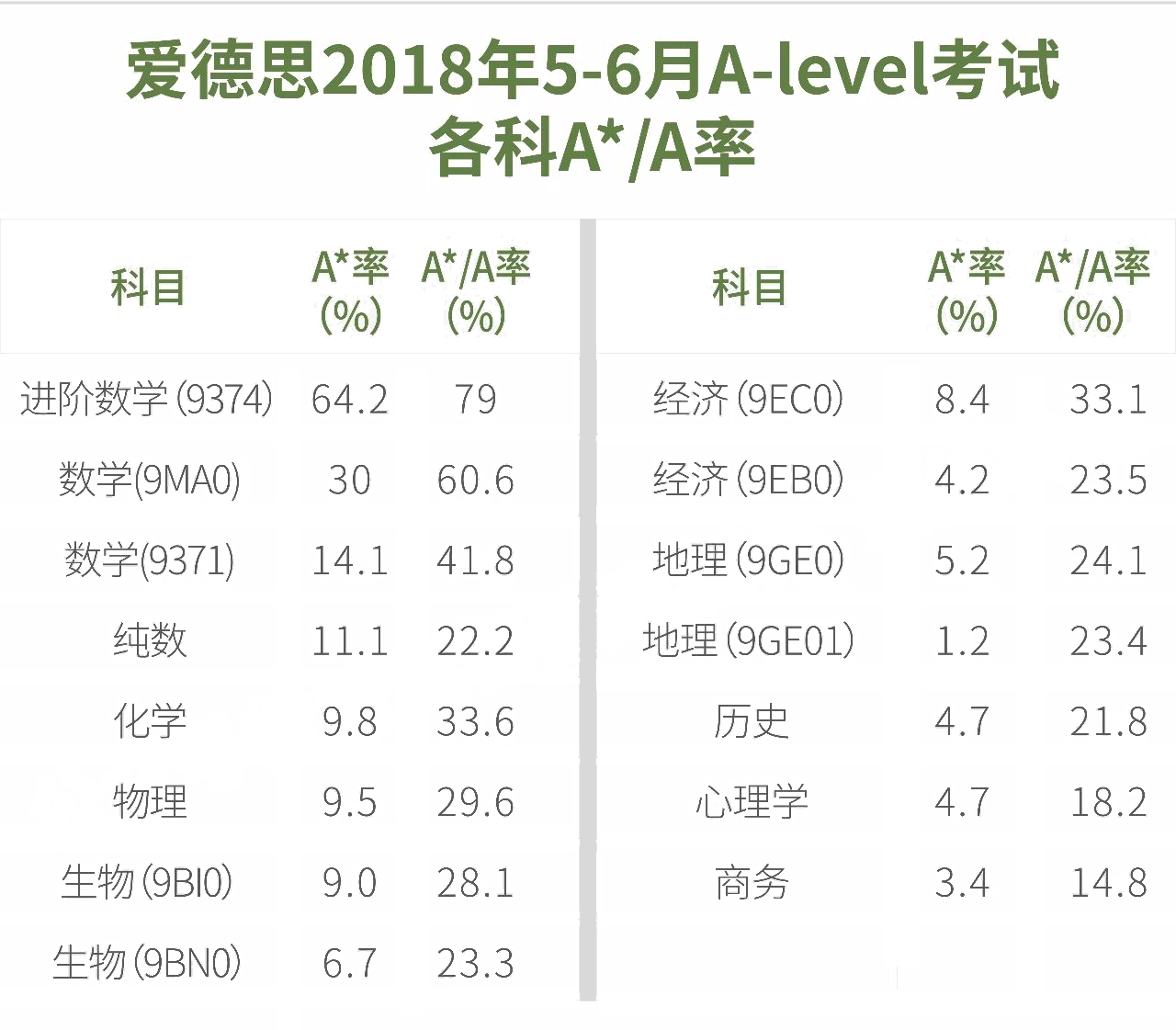 ▲剑桥国际公布的2018年6月A-Level各科得A率